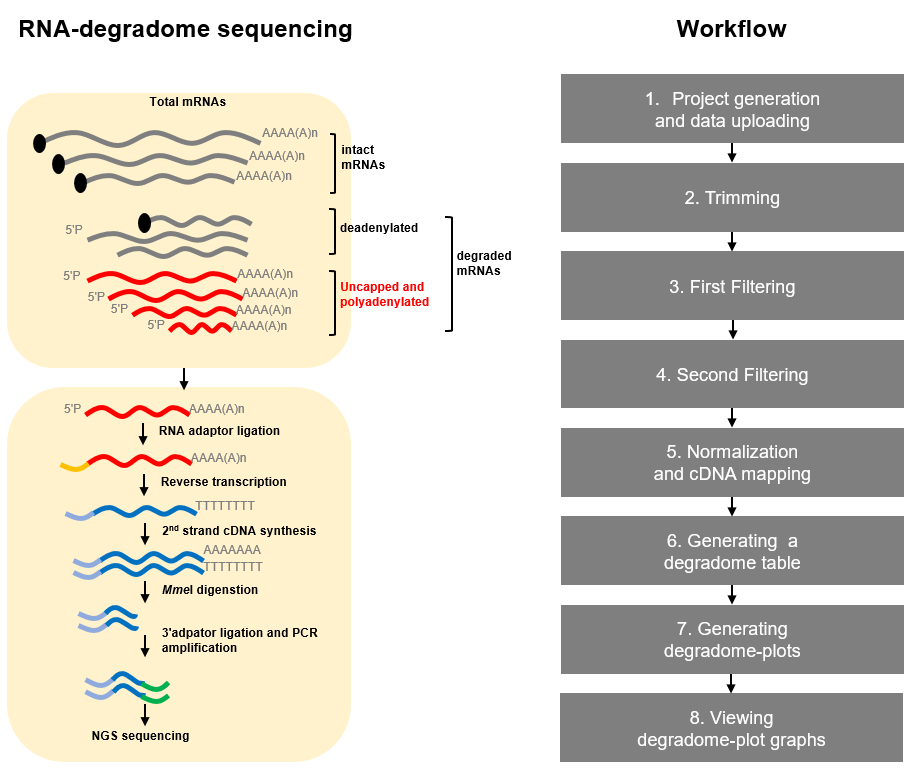 RNA degradome-seq is also know as PARE-seq (Parallel Analysis of RNA Ends-seq). It is originally developed to identify miRNA-mediated target mRNA cleavages at the genome-wide level (German et al., 2008 Nature Biotechnology).